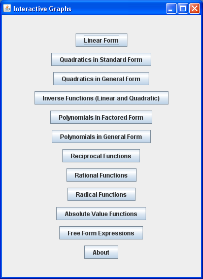 Interactive Graphs.... .... A utility to help visualize graphs of linear, quadratics, and polynomials. You can use it as a teaching aid and/or let students explore on their own.